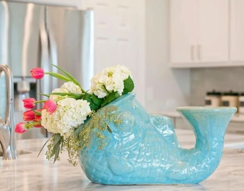 Flower bouquet in a blue vintage fish vase by HPID Interior Design.